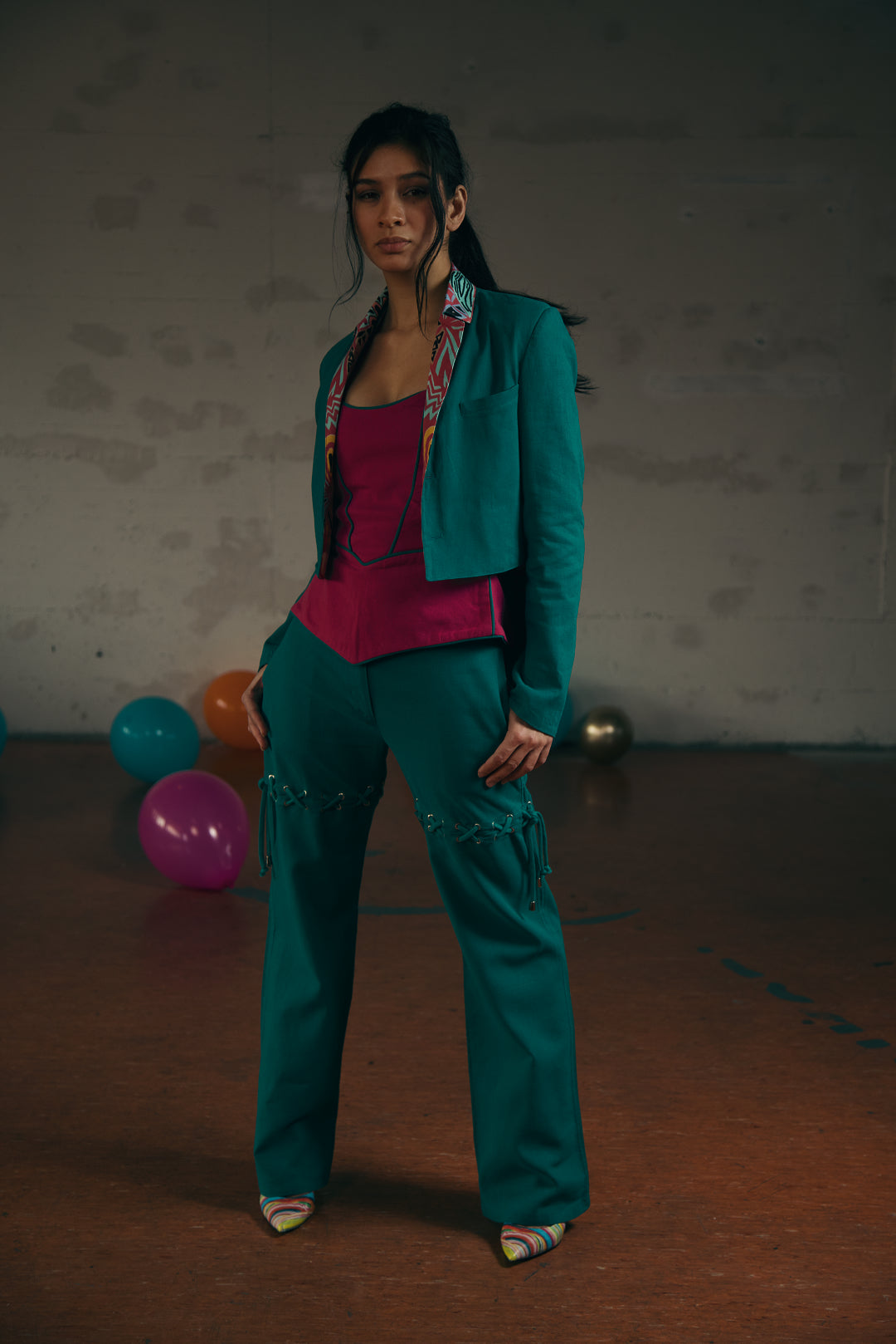 Turquoise green trousers that are detachable into shorts with colour blocking side and back pink pockets. Made from linen, suited for multiple situations like office, Vacation.